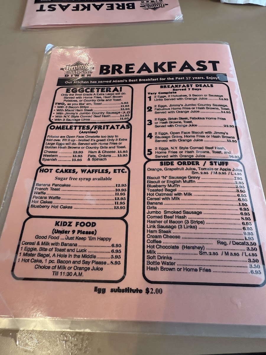 Welcome to Jimmy's Eastside Diner, an iconic gem nestled in the heart of Miami. Known for its unpretentious atmosphere and generous portions, this diner promises to take you on a nostalgic culinary journey. The menu proudly features classics like the Cheese Omelette and Spanish Omelette, alongside hearty options like the Bacon Cheeseburger and Banana Pancakes, which patrons rave about for their indulgent flavor and perfect fluffiness.