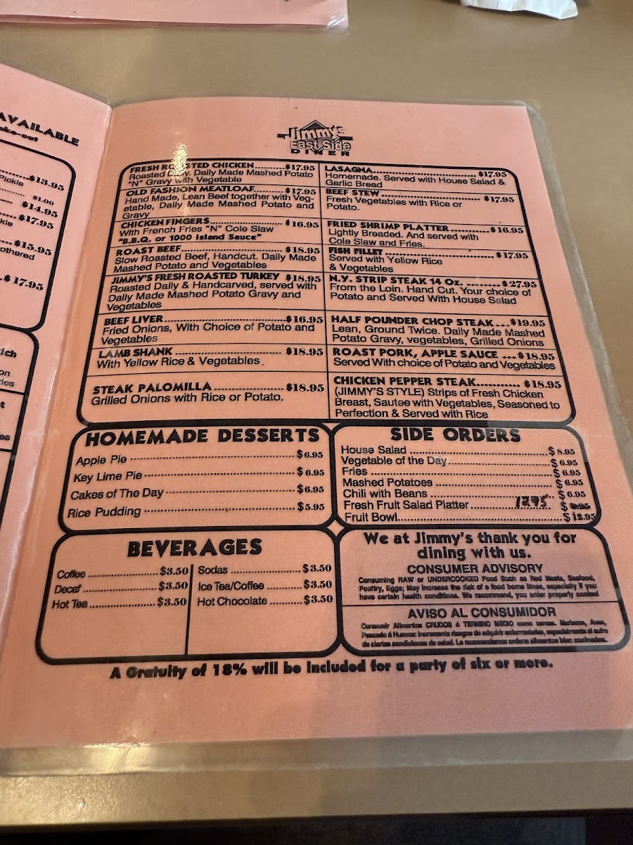 Customers appreciate the free-flowing coffee and homemade dishes, reflecting a genuine American diner experience. Highlights include the hash browns, praised for their ideal crispiness and comfort. With friendly service and reasonable prices, Jimmy's is the quintessential spot for breakfast or lunch, whether you're in the mood for a satisfying Chef Salad or a comforting bowl of homemade Chicken Noodle Soup.